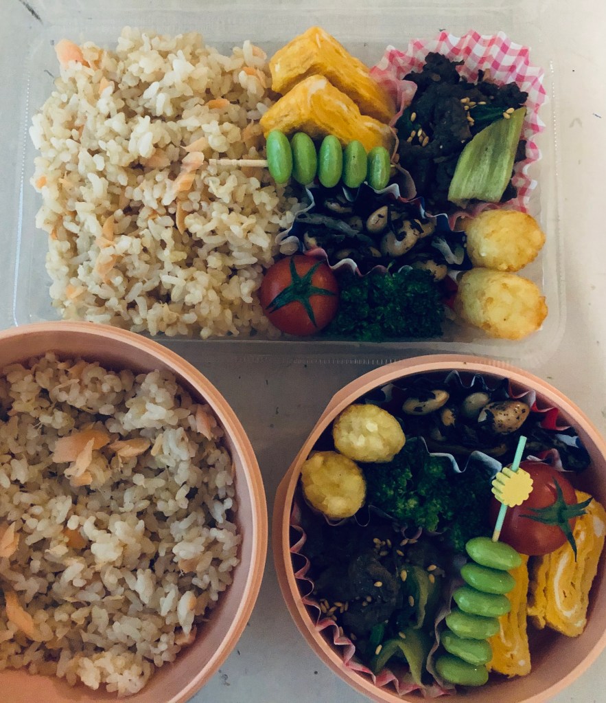 牛肉と青梗菜炒めと鮭のまぜご飯🐄