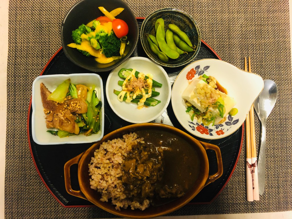 雑穀米なすカレー🍛と青梗菜こま切れ肉炒め