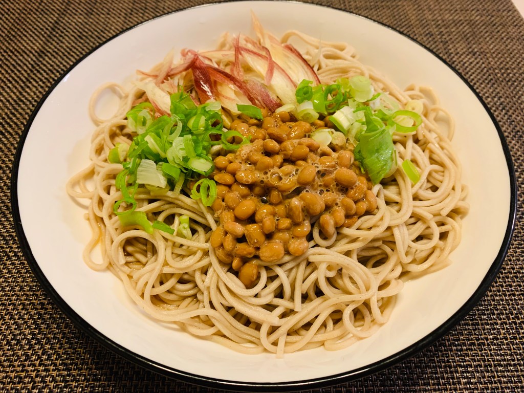 薬味とにゅるにゅる納豆のせ冷やし蕎麦🎐