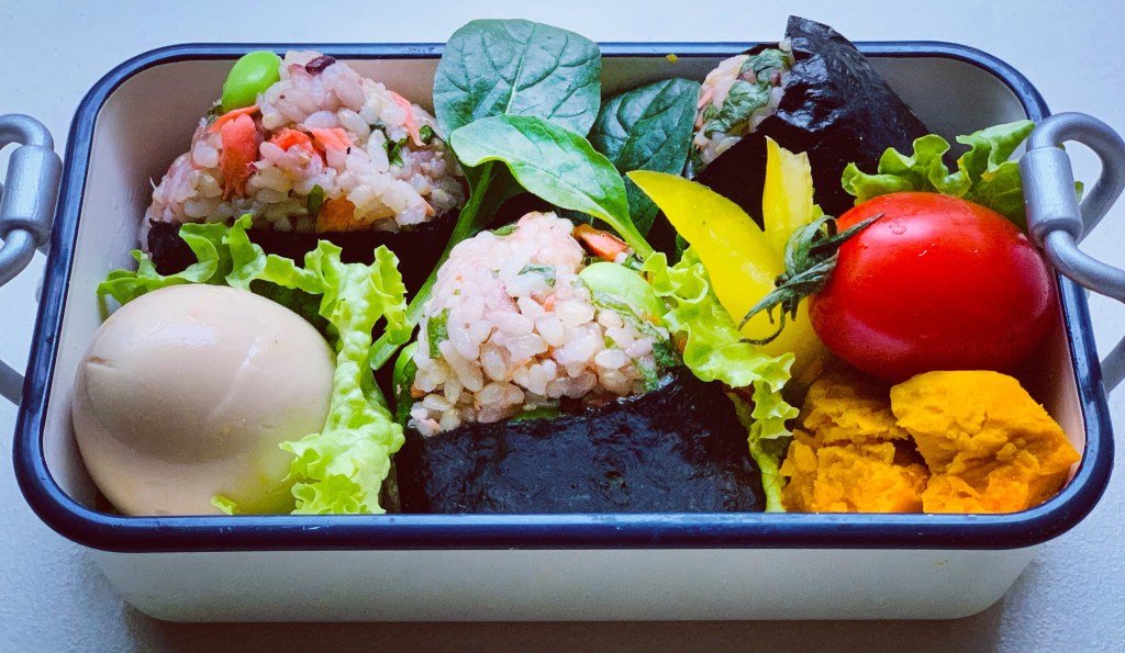 大葉&鮭、枝豆のおにぎり弁当🍙🍙🍙カボチャが甘くてほくほくしてます💕