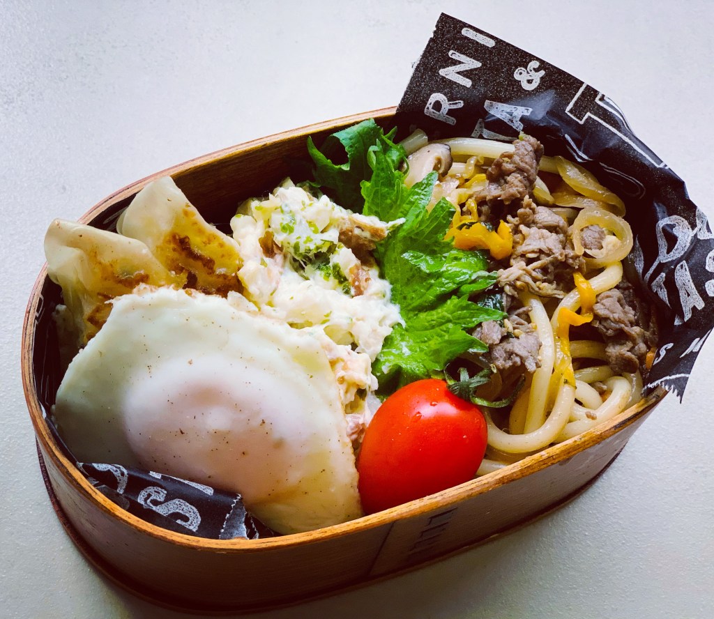 夕食残りのチャプチェを混ぜて焼うどんて😆里芋ポテサラとsunny-side up🍳