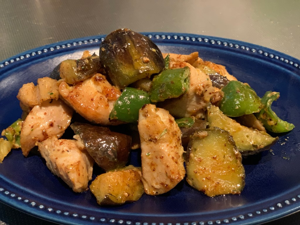 ムネ肉ピーマン茄子のハニーマスタード炒め😊